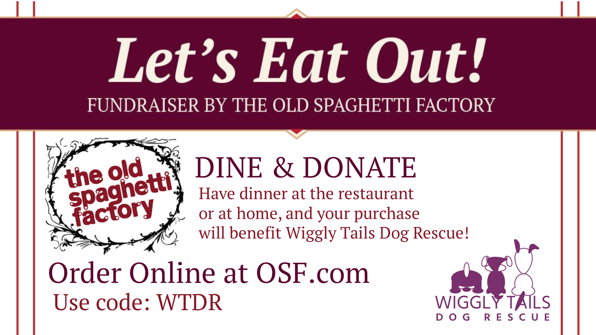 The Eugene, OR, Old Spaghetti Factory is hosting a fundraiser for Wiggly Tails Dog Rescue on January 20, 2026, between 11:30 am and 9:00 pm. Both online, delivery, and in-store dining orders will count toward the fundraiser if the code "WTDR" is mentioned or if you bring in a flyer [Download Here]
